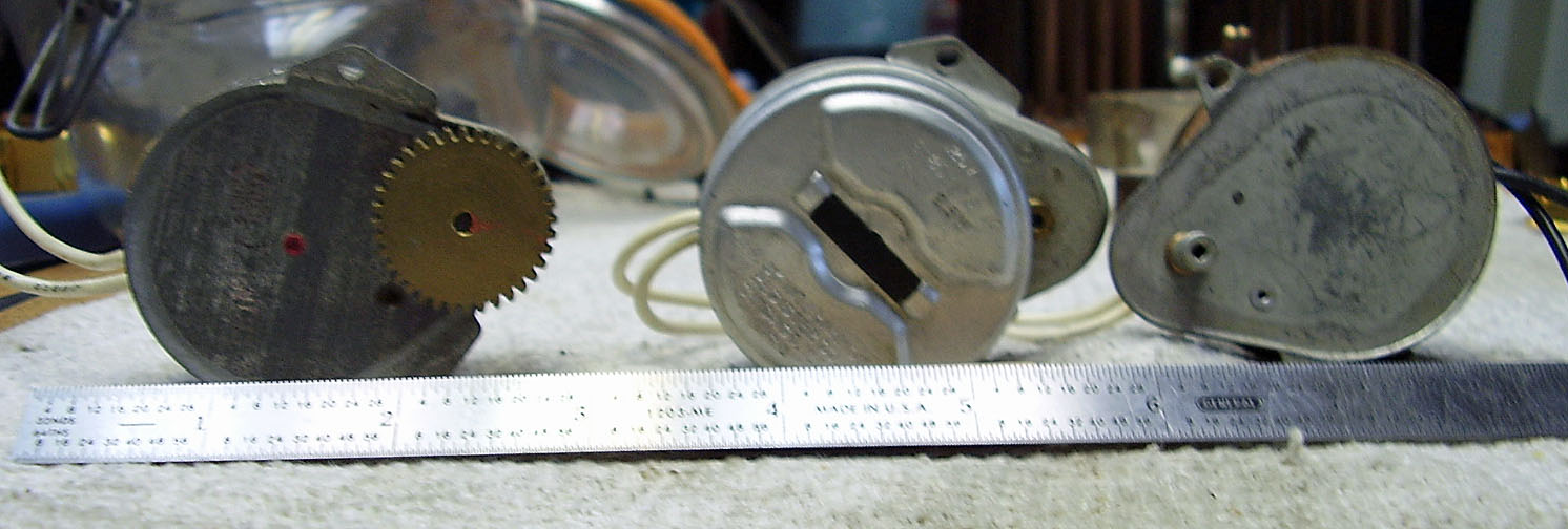My business is rebuilding your original motor, when possible. In order to rebuild (overhaul) your motor I need you to do at least one thing before you send in the motor. Please take a Multimeter or Volt/Ohm meter, these are less than $20.00 at any hardware store, and with no current on the motor, set the meter to Ohms and touch the two leads to the end of the wires or the posts where the wires connect and see if you get a reading. Just about any reading is a good one. The motor does not have to be running to perform this test. But if you get no reading what-so-ever then the motor's coil is dead and I cannot repair your motor. You should still send it in because I may have an identical one in inventory that I can rebuild. It would be best if you E-mail me before sending in a dead motor because I can check based on your picture if I have one. I am able to rebuilt all Jefferson "Golden" motors. All of these motors cost $250.00 plus $20.00 priority mail (Canada is $45.00) and has a 2-year warranty, which brings your total cost to $270.00. This is only for the older original clock motor which were made by International Register and some Intermatic. The internal coil does short out over time and even if your motor passes the heat test, (details below) I cannot be positive that your coil has the strength to do its job. Therefore with any original motor I can only offer 1/2 ($125.00) refund should it fail during the 2-year warranty. If I have another in stock, then I will offer to try another but that would be the end of the warranty because I cannot offer a warranty in perpetude on these old motors. I try and rebuild your old motor but if that's not possible then I may have a old original motor and that would add $100.00 for a total of $370.00 which included the $20.00 shipping and handling. I do not know of any substitute. For those interested in such matters the Golden Secret motor turns at 1/60 RPM or 1 RPH and the Golden Suspense motor turns at 10 RPH or 1 Rev. every 6 minutes.